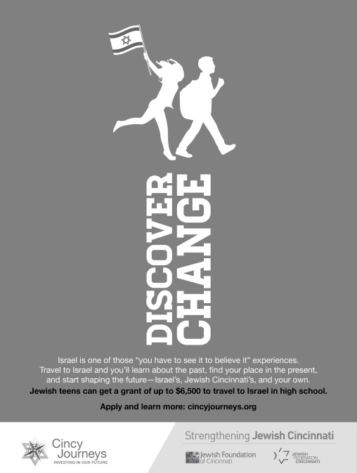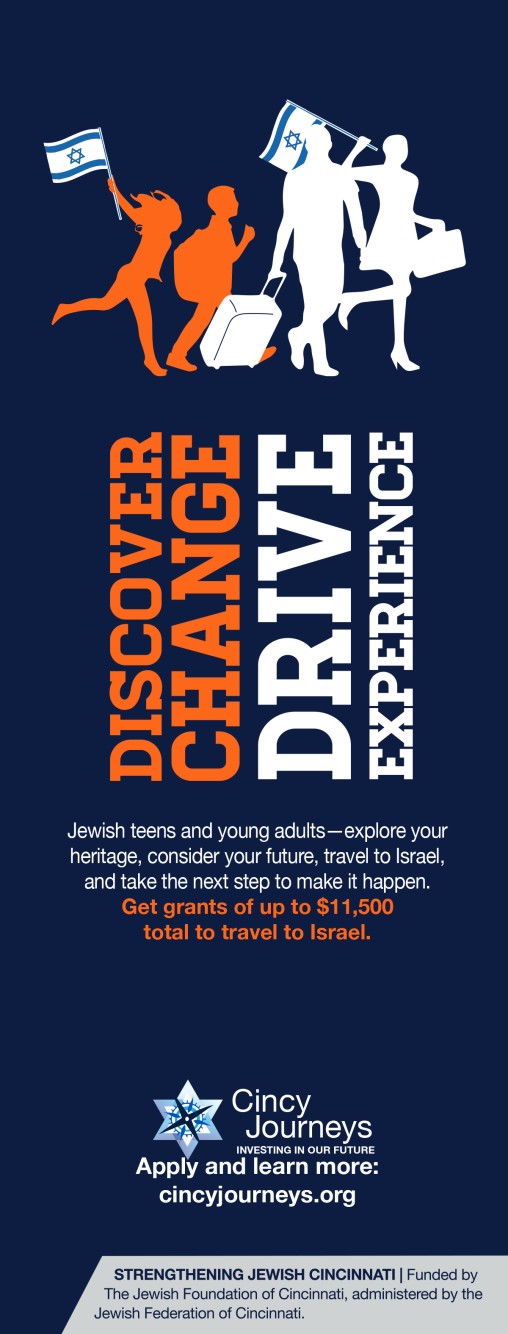 Cincy Journeys post high school Israel travel ads are available upon request. Contact Karyn Zimerman at [email protected]. Please note the publication where the ad will be appearing and provide the dimensions and deadline for delivery of artwork. Ads may take up to 3 weeks to create.